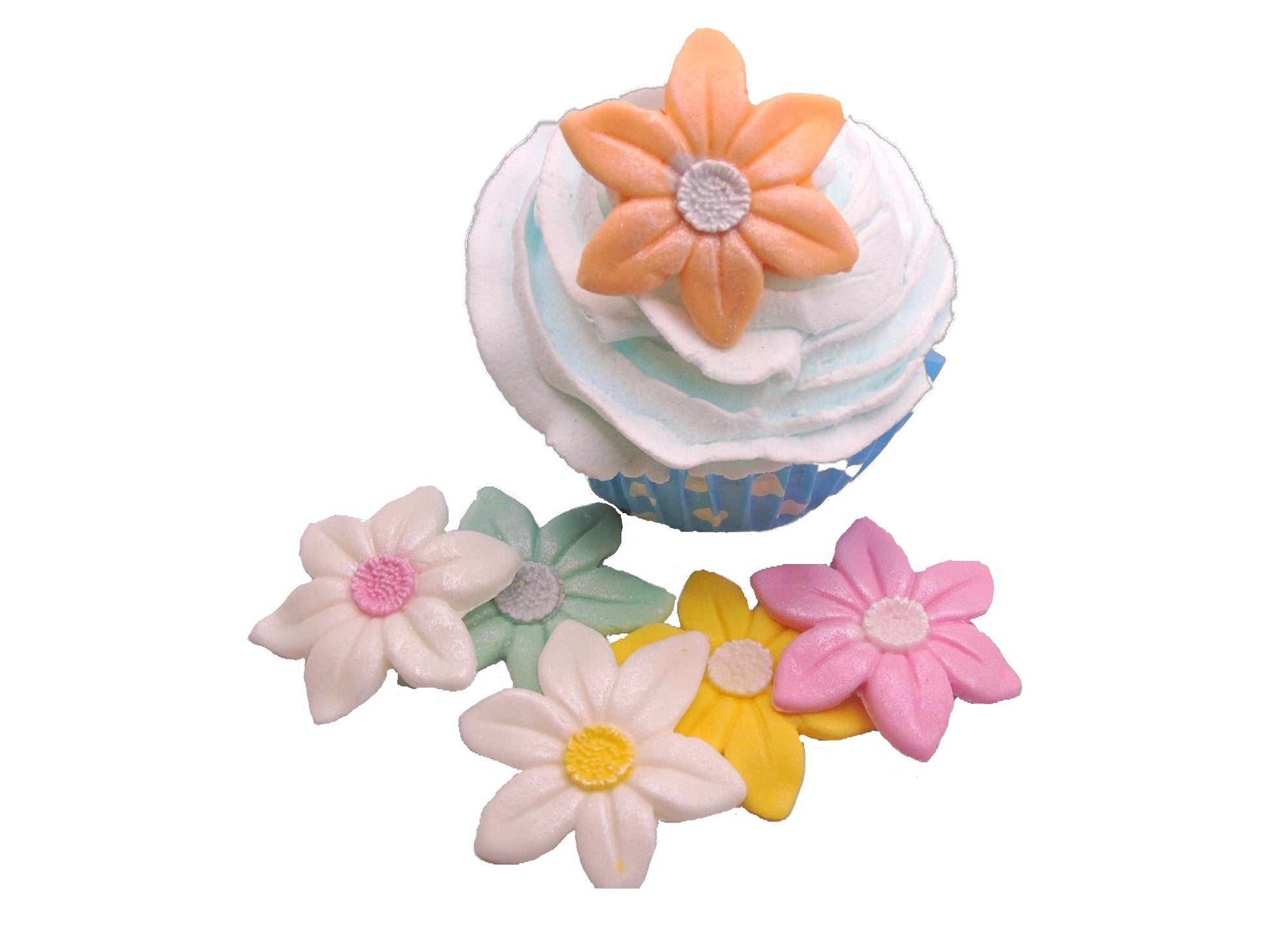 6 Handmade Glittered Pastel Flowers Edible Cupcake Toppers